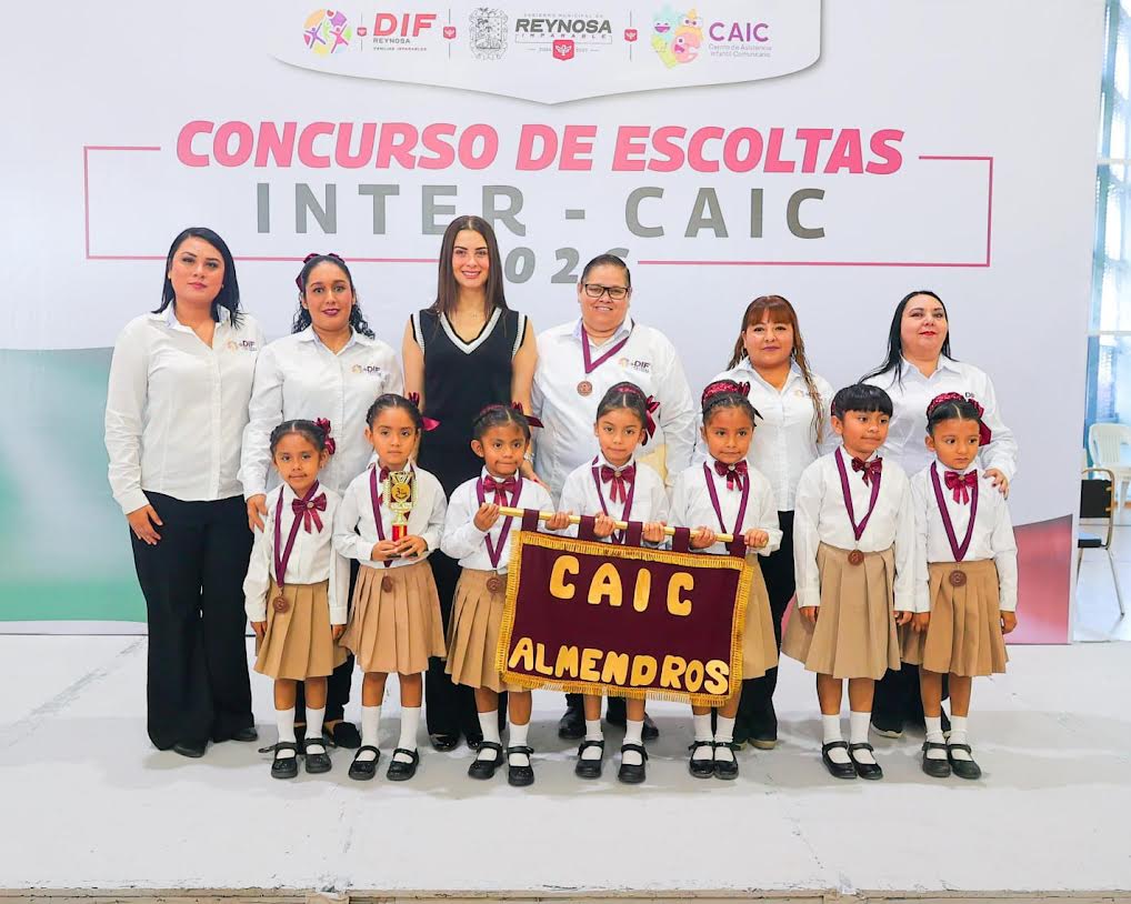 El Sistema DIF-Reynosa que preside Carlos Luis Peña Garza, llevó a cabo el Concurso de Escoltas Inter-CAIC 2026, donde 86 niñas y niños de educación preescolar participaron demostrando disciplina, coordinación y respeto por los símbolos patrios.