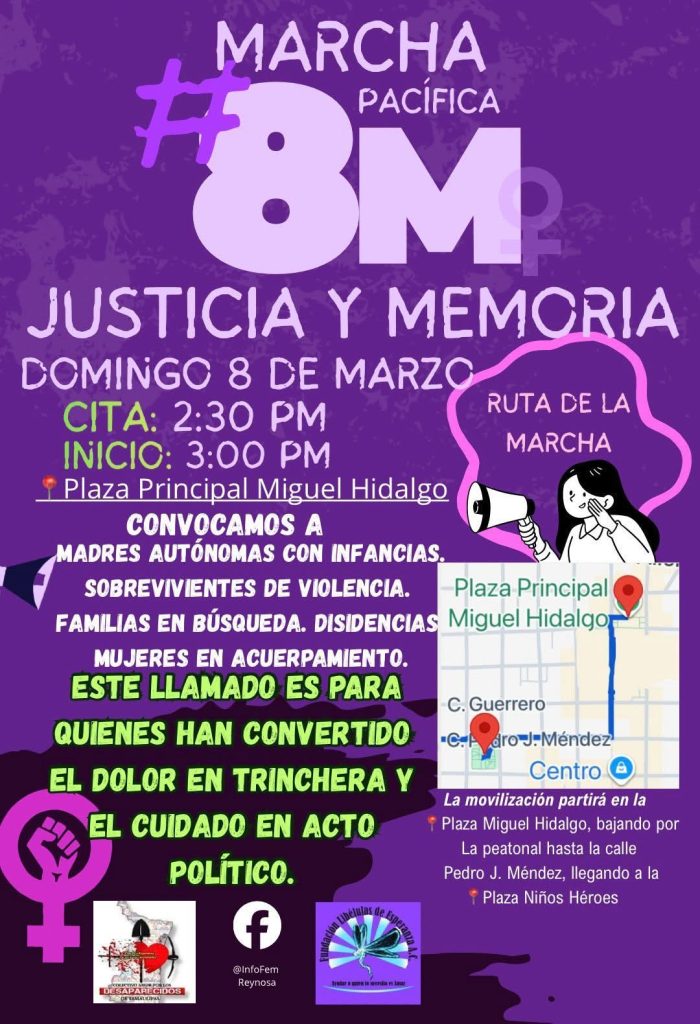 La movilización es organizada por Fundación Libélulas de Esperanza y el Colectivo Amor por los Desaparecidos en Tamaulipas, quienes convocaron a las participantes a concentrarse a las 2:30 de la tarde en la plaza Miguel Hidalgo, frente a la Presidencia Municipal. El contingente tiene previsto iniciar el recorrido a las 3:00 de la tarde.