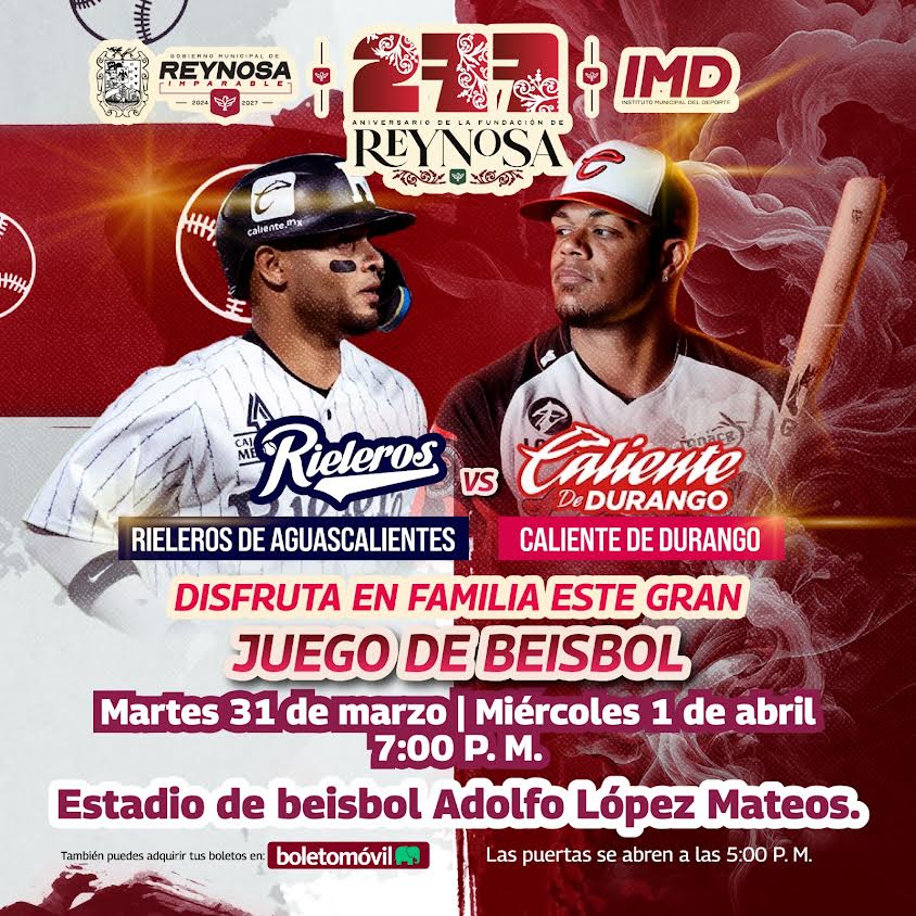 La Liga Mexicana de Beisbol y el Gobierno Municipal de Reynosa ofrecen este espectáculo deportivo durante la preparación de sus equipos, no te pierdas la oportunidad de vivir el ambiente beisbolero celebrando el 277 Aniversario de la Fundación de Reynosa; taquillas abiertas desde las 5:00 P. M. o adquiere tu entrada en la plataforma de Boletomóvil.