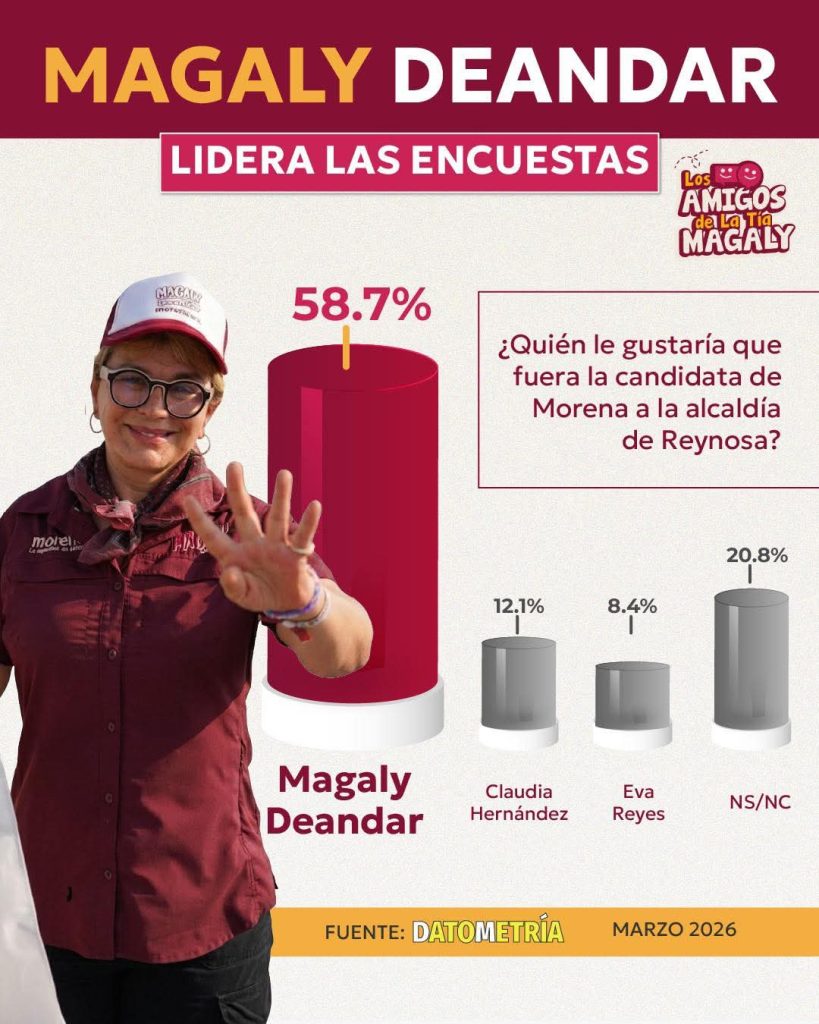 Reynosa, Tamaulipas.— La diputada local Magaly Deándar encabeza las preferencias ciudadanas como posible candidata de Morena a la alcaldía de Reynosa, de acuerdo con una encuesta reciente.