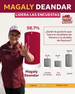 Reynosa, Tamaulipas.— La diputada local Magaly Deándar encabeza las preferencias ciudadanas como posible candidata de Morena a la alcaldía de Reynosa, de acuerdo con una